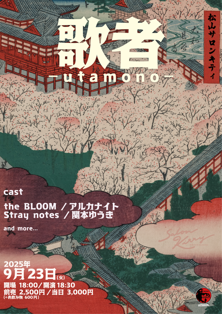 歌者 -utamono- SCHEDULE 2025/09/23(火) 18:30 - 松山SALONKITTY 地図を表示 前売 ¥2,500/当日 ¥3,000(+1drink) Open 18:00/Start 18:30 cast The Bl00M アルカナイト Stray notes 関本ゆうき 入場順:当日整列順 チケット予約:バンド予約/会場Tiget Tiget URL URLをコピーする 報告する
