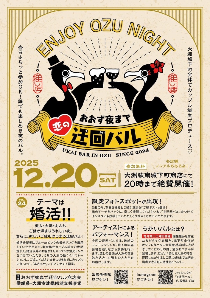 おおず夜まで恋の迂回バル SCHEDULE 2025/12/20(土) 17:00 - 20:00 17:00〜20:00 HARU&AYATO HARUと2人で"流し"します!! 19店舗まわるぞい! URLをコピーする 報告する