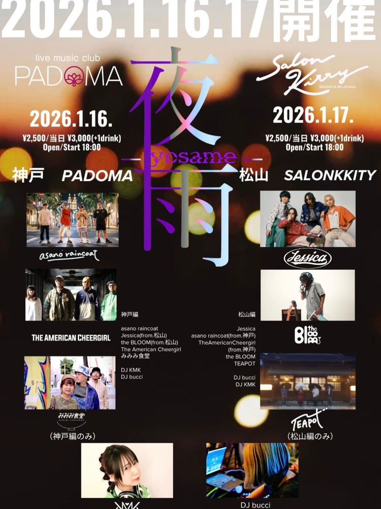 夜雨-yosame- 松山SALONKITTY編 SCHEDULE 2026/01/17(土) 18:00 - 松山SALONKITTY OPEN/START 18:00 前売 ¥2,500/当日 ¥3,000(+1drink) castJessicaasano raincoatThe American CheergirlTEAPOTTHE BL00M DJbucciDJ KMK 入場順:当日整列順チケット予約:会場tiget、各出演者予約 Tiget URL URLをコピーする 報告する